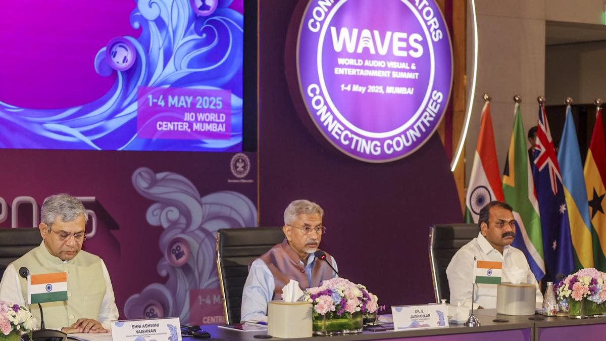 The Minister of External Affairs, S Jaishankar, together with IT Minister Ashwini Vaishnaw and Mos l Murugan, co -chapter, the dialogue of the global media at the World Summit of Visual Audio and Entertainment (Onas), in Mumbai | Photo credit: –