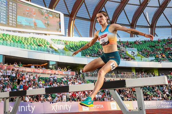 Jane Hedengren, BYU, on her way to the NCAA 10,000+ m record of 30:46.80 at the Stanford Invitational, April 3, 2026, photo by BYU Track & Field
