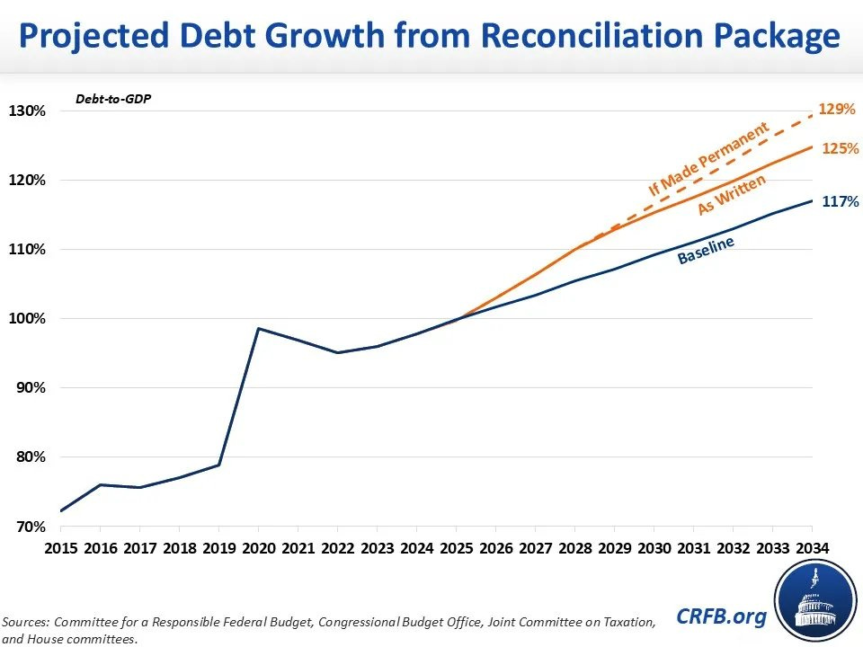 The developing House reconciliation bill is shaping up to add roughly $3.3 trillion to the debt through Fiscal Year (FY) 2034 and is setting the stage for more than $5.2 trillion of additional debt if policymakers ultimately extend temporary provisions.(CRFB.org)