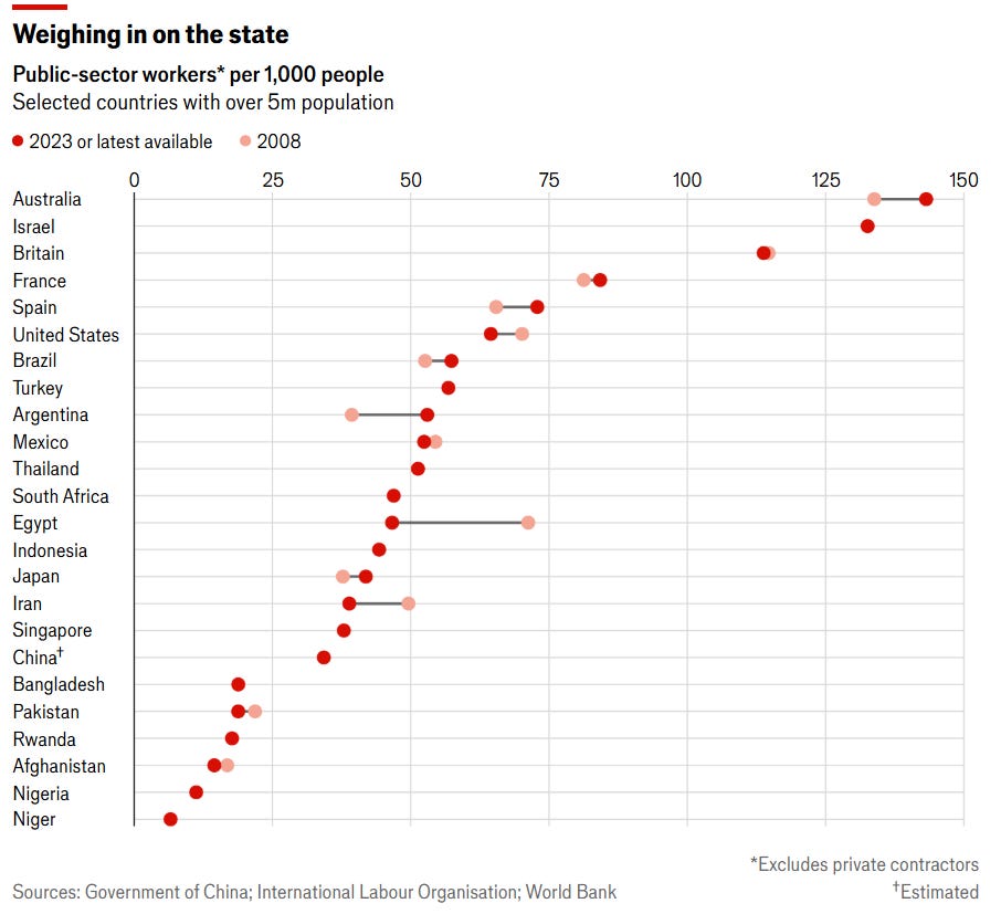 Developed nations typically have larger public sectors. However, accurately measuring and comparing government workforce sizes is challenging due to varying bureaucratic structures. (The Economist)