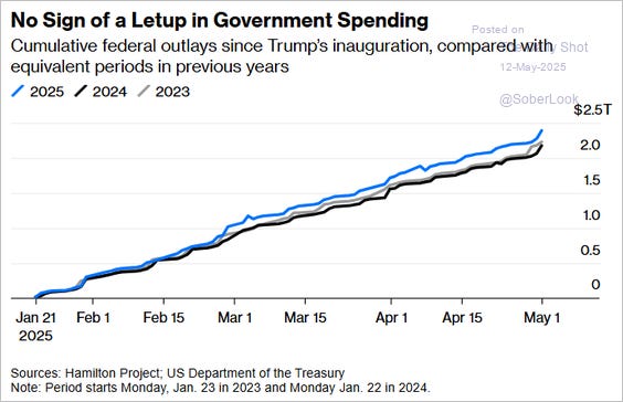 Latest update, DOGE didn’t work. Government outlays are up over previous years. (The Daily Shot)