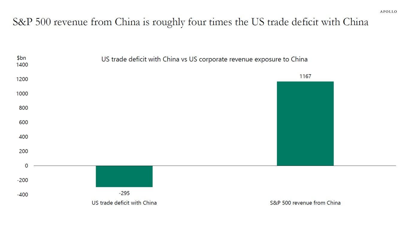 S&P 500 companies generate approximately 7% of their annual revenue in China, totaling $1.2 trillion. This revenue from Chinese consumers is roughly four times the size of the US-China trade deficit in goods. Comments from Scott Bessent indicate the US may become more targeted around strategic industries. (Apollo)