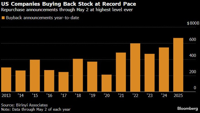 US stock buybacks announced YTD exceed $600B, pace exceeds 2022’s high of $598.5B. This could help buoy equity markets. (@LizAnnSonders)