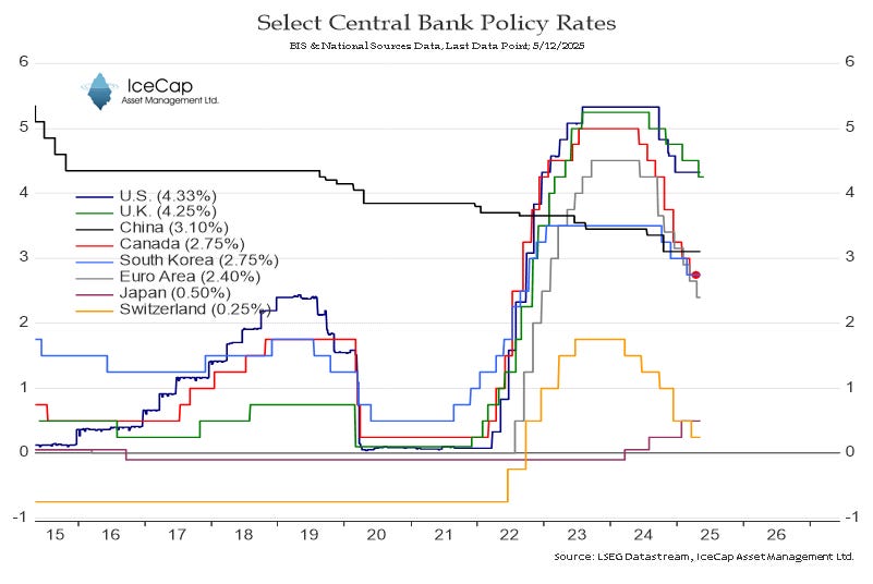 Major global central banks around the world are collectively cutting rates. Japan is the outlier. UK and the US have rates stubbornly high compared to peers. (@RichardDias_CFA)
