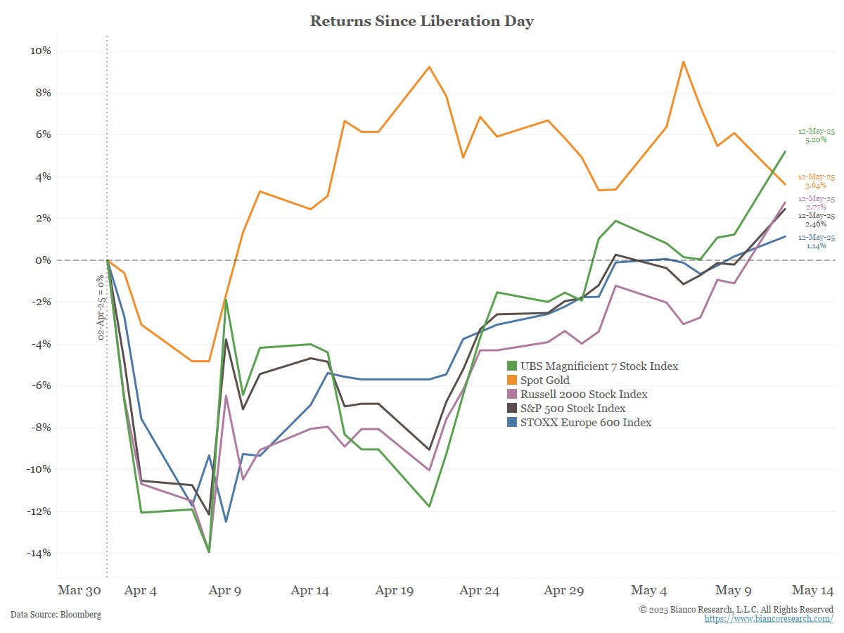 Mag 7 is now outperforming gold since liberation day. (@biancoresearch)