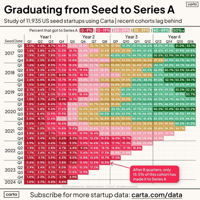 Next time you are shown a seed deal remember this stat; after 8 quarters, only 15.5% of Start-ups have advanced to series A. 2 years ago this number was twice as high. (@PeterJ_Walker)