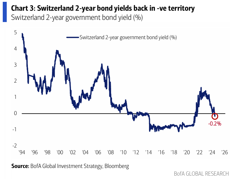 Swiss bonds are back in negative territory. The first indication parts of the world are back in a zero interest rate world. (BofA)