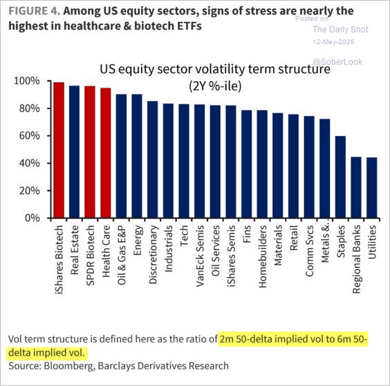 Healthcare and biotech face significant policy-driven uncertainty. Elevated short-term implied volatility in sector ETFs, relative to longer-dated levels, signals heightened near-term uncertainty. (The Daily Shot)
