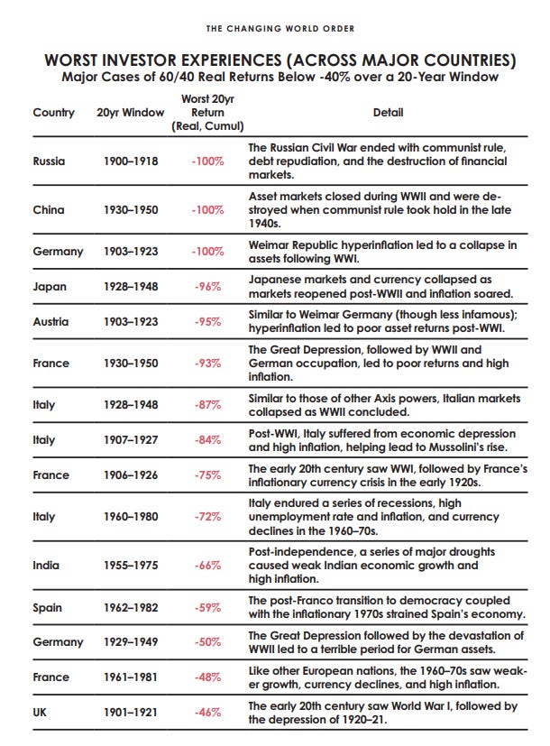 It has happened before it could happen again. Worst 20 year real return periods for the 60/40 portfolio across geographies. A set and forget 60/40 portfolio will be insufficient to protect wealth across all regimes. (@MikeZaccardi)