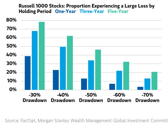 I’ve seen it many times, wealth is built through a concentrated position but concentrated positions will be exposed to drawdowns. Over a 5 year period, 60% of stocks in the Russell 1000 have a 40% drawdown or more. (@MebFaber)