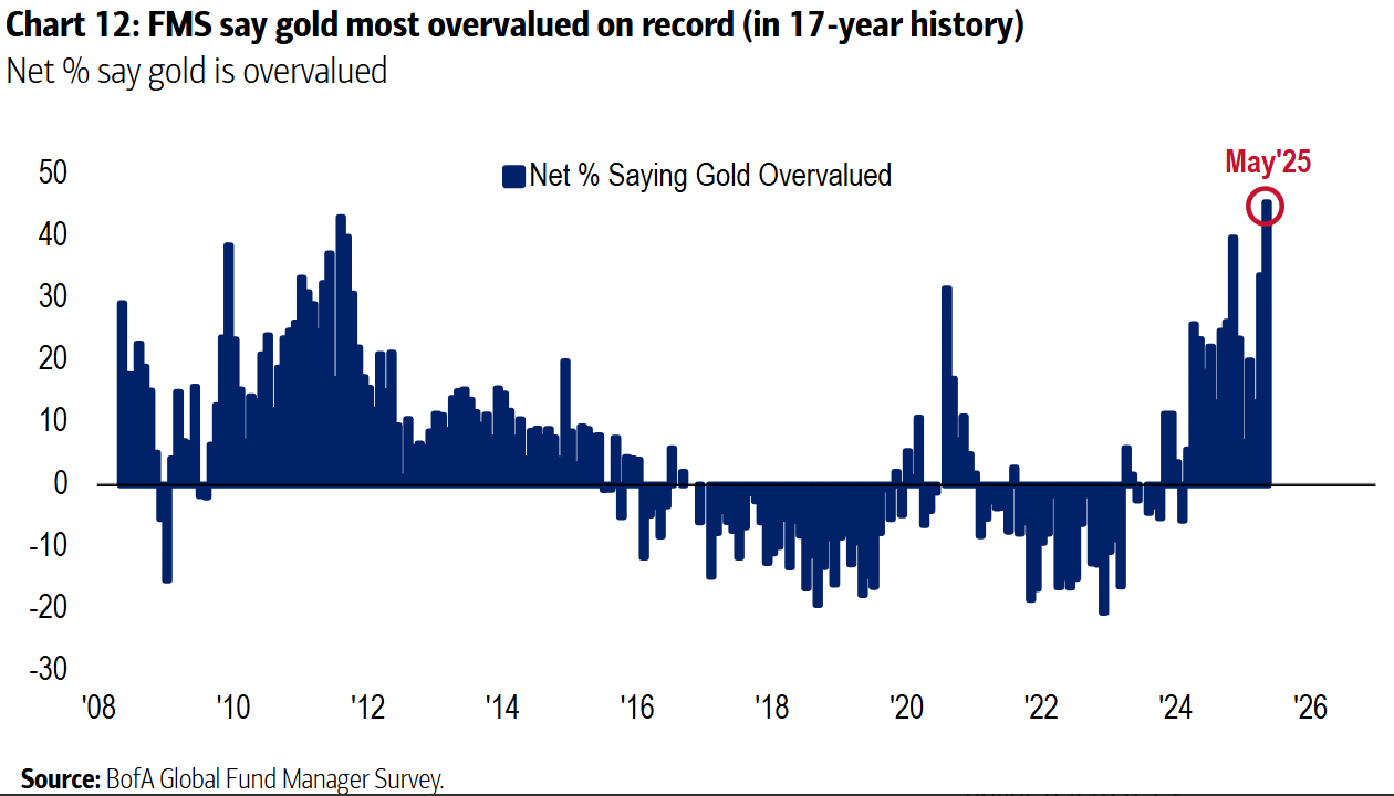 Fund managers see gold as most overvalued in 17 years. (BofA)