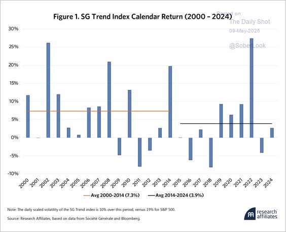 Trend following is/was once considered a diversifying strategy to equities and bonds but the performance has been disappointing over the past decade. Did success attract capital that diminished returns? (The Daily Shot)