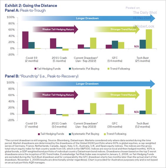 Not every drawdown is the same and this means different defensive strategies will fare better or worse depending on the type of drawdown. I saw a few tail hedging strategies that were down in April despite the violent but brief sell off. (The Daily Shot)