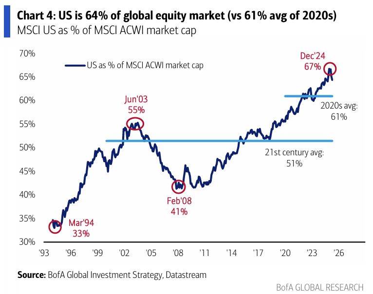 US exposure still makes up 64% of global equity markets. US equities are one of the largest most liquid positions of investors globally. Hope we don’t find out what happens when flows reverse. (BofA)