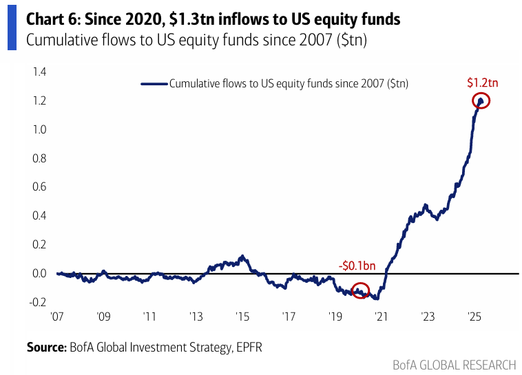 Since 2020, over $1.3T has been invested in US equity funds. I struggle to reconcile neutral flows for a decade, transitioning to the explosive flows in the past couple years. (BofA)