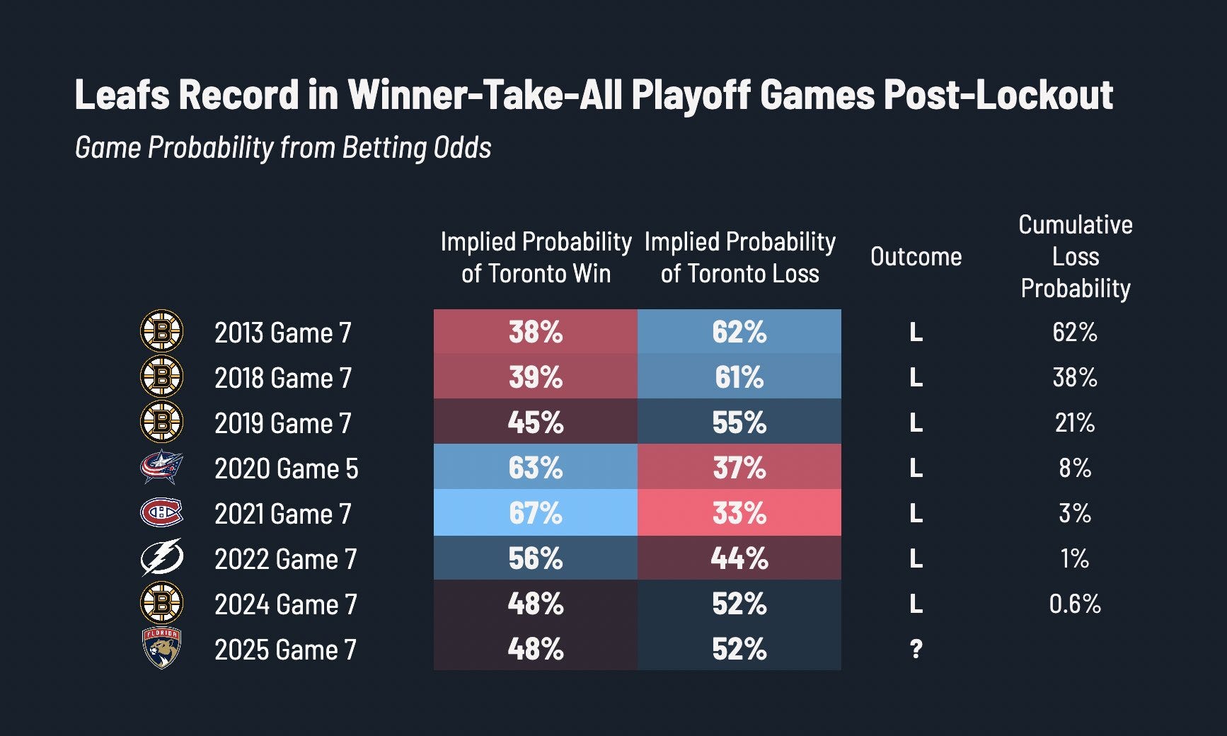 The Leafs have won 2 playoff series in the past 20 years, and have lost 8 straight winner take all games. Sad. (@JFreshHockey)