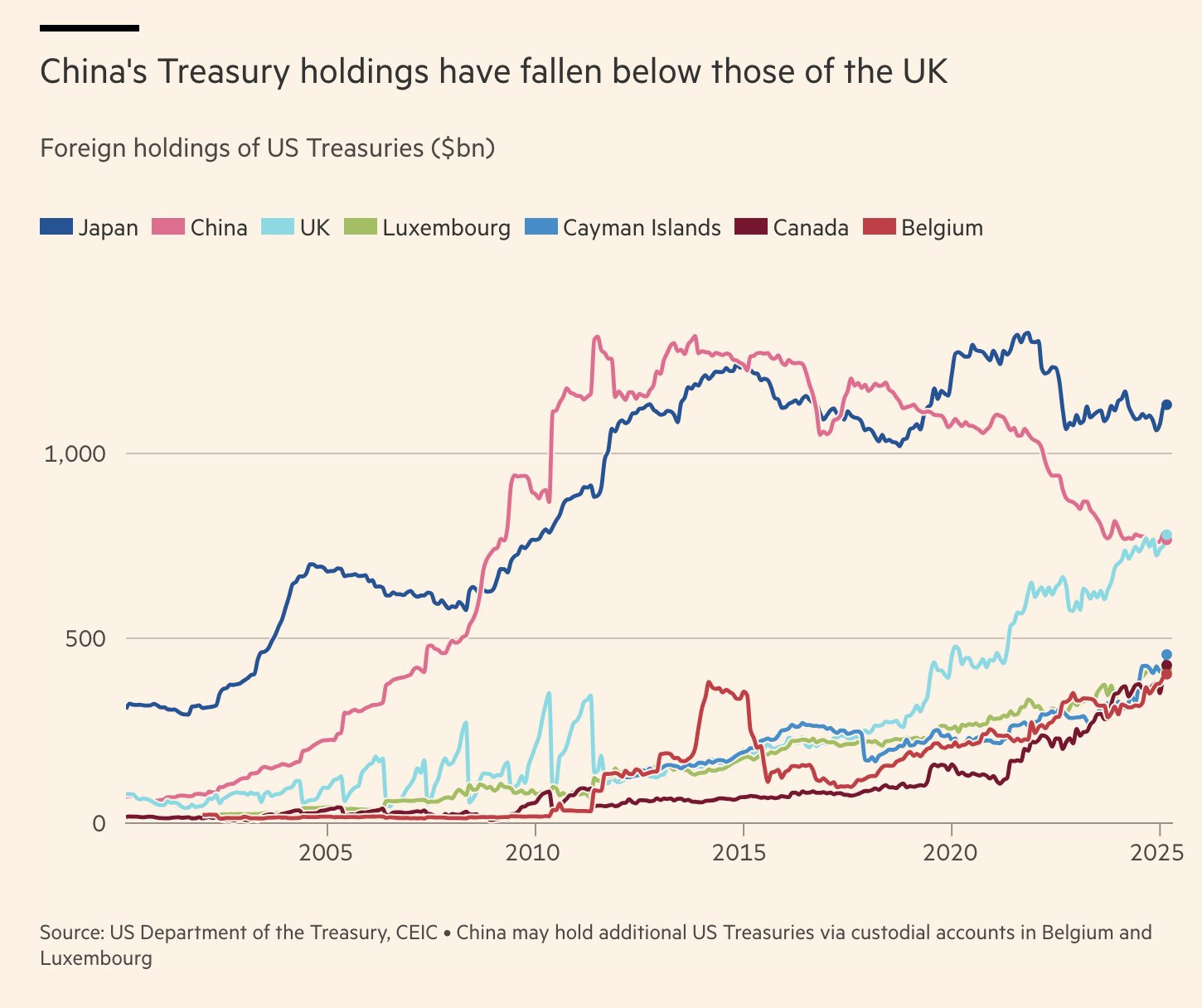UK now holds the second-largest share of US Treasuries, surpassing China amid Beijing’s diversification efforts. (@Schuldensuehner)