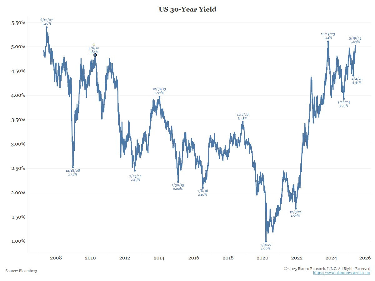 The US 30Y is approaching levels where it will start making headlines and could cause problems for equity markets. So much for this administration’s attempt to crash yields and term out debt. Bond market intervention may be next. (@biancoresearch)