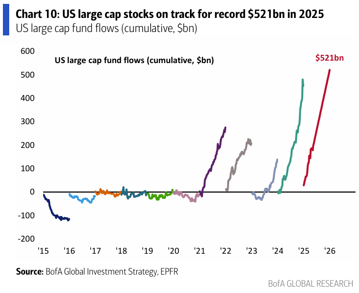 Despite the US stock market weakness, flows into US large cap funds continue. (BofA)