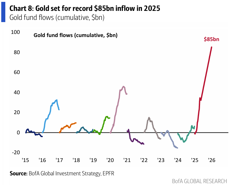 Gold fund flows are on track for a record year. (BofA)