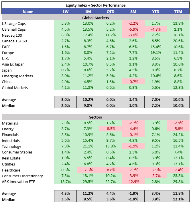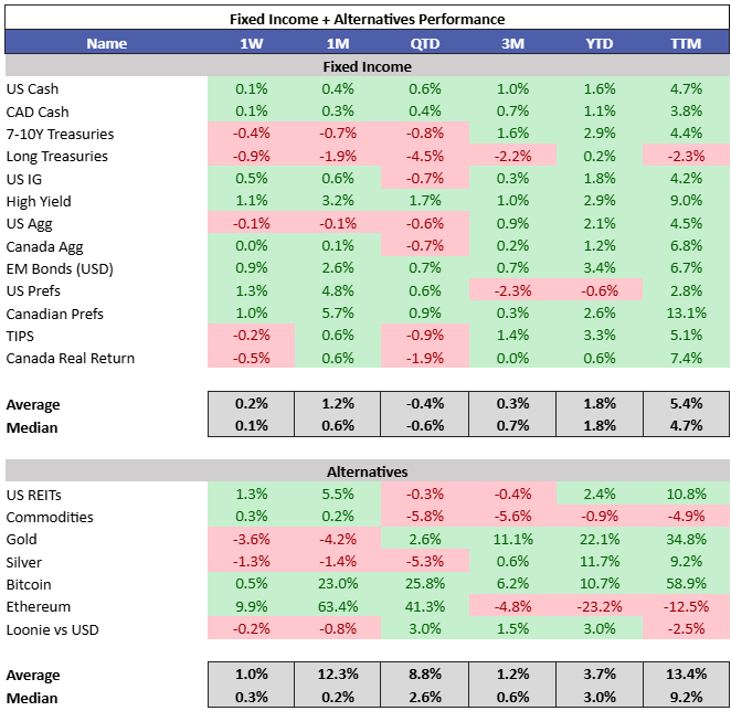 10Y yields were up 10 bps in the US and 2 bps in Canada, resulting in a mixed week for fixed income. Precious metals sold off as risk rallied. Eth continues to recover some of its losses YTD.