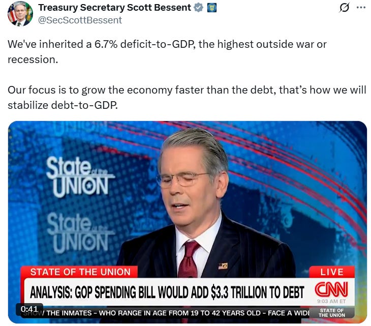 Bessent makes it clear his intention is to grow the economy faster than the deficit is rising. This is essentially the financial repression playbook; bad for bond investors. The next evolution is yield curve suppression. (link)