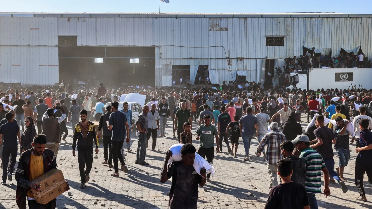 Footage showed thousands of people breaking into the Al-Ghafari warehouse in Deir Al-Balah and taking bags of flour and cartons of food as gunshots rang out. It was not immediately clearwhere the gunshots came from or who fired them.